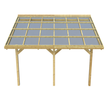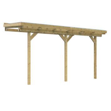 De aanbouw overkapping is 424 cm breed en 424 cm diep. De nokhoogte is 266 cm en heeft een aflopend dak. Deze overkapping kan bevestigd worden tegen een zijde van je woning of een schuurtje. Deze is ideaal voor een veranda om tegen je woning te plaatsen, maar ook zeer geschikt om bijvoorbeeld fietsen en scooters onder te plaatsen. De aanbouw overkapping is gemaakt van geïmpregneerde grenen palen en balken. De overkapping heeft 3 staanders met een kopmaat van 9x9 cm een . De overkapping is inclusief transparante dakbedekking. Het is uiteraard mogelijk om zelf een andere typedakbedekking erop te maken.Bevestigen van de overkapping