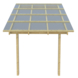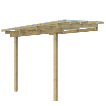 De constructie bestaat uit geïmpregneerd grenen hout en twee staanders van 9 x 9 cm. Het schuine dak is afgewerkt met transparante kunststof dakplaten, waardoor er veel licht onder de overkapping blijft.