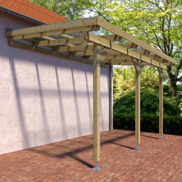 De aanbouw overkapping in geïmpregneerd grenen van 424 x 257 cm is geschikt om tegen een woning of bijgebouw te plaatsen. Met een nokhoogte van 266 cm krijg je een ruime, beschutte plek aan huis.