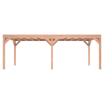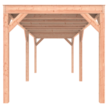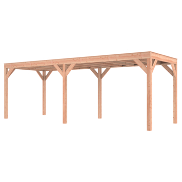 Deze modern vormgegeven overkapping biedt een perfecte balans tussen uitstraling en functionaliteit.De totale afmetingen zijn 245 cm hoog, 695 cm breed en 255 cm diep en de doorloophoogte is 224 cm.Zoek je een overdekte plek voor ontspanning in de tuin? Deze sfeervolle overkapping is een aanwinst voor iedere tuin.Klaar voor een groene toekomst:Dit modern vormgegeven tuinverblijf is speciaal ontworpen om zonnepanelen of een sedum dak te kunnen ondersteunen. Hierdoor is dit verblijf een duurzame en milieuvriendelijke aanvulling op uw tuin.Zelf aan de slagDankzij de duidelijke opbouwomschrijving, meegeleverde bevestigingsmaterialen en op maat gezaagde onderdelen, is de installatie van dit tuinhuis een haalbare klus voor iedere gemiddelde doe-het-zelver. Dak bekleding:Wij raden aan om deze Douglas overkapping te voorzien van een EPDM dakbekleding voor een lekvrij dak (Let op: los bij te bestellen).Onderhoud:Bij het kopen van een overkapping is onderhoud een aandachtspunt… Met Douglas hout heb je het goed voor elkaar, Douglas is namelijk van zichzelf al een sterke houtsoort. Het gaat zonder extra behandeling eenvoudig 10 tot 15 jaar mee. Om de maximale levensduur te verlengen kun je gebruik maken van speciale Douglas beits of Douglas olie en elke 2 jaar opnieuw beitsen of oliën.