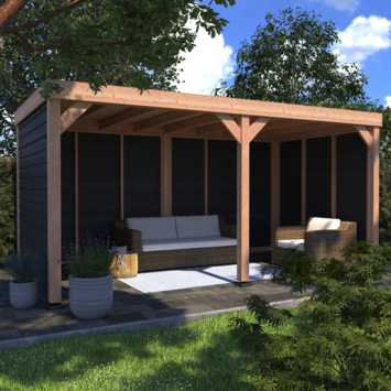 Deze Douglas terrasoverkapping met wanden is een toegevoegde waarde voor iedere tuin. De karakteristieke look die Douglas hout in jouw tuin brengt, zorgt voor een natuurlijke en vooral sfeervolle uitstraling. Het Douglas hout is een sterke soort tuinhout dat van nature goed bestand is tegen vuil en vocht. Deze houten overkapping is 522 cm breed en 270 cm diep en wordt geleverd inclusief EPDM-folie voor een waterdichte dakbedekking. Het totaalpakket staat extra stevig dankzij de 12x12 cm Douglas palen.