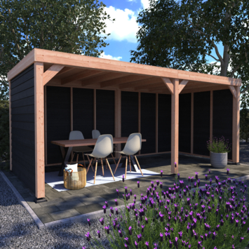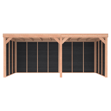 Deze Douglas terrasoverkapping met wanden is een toegevoegde waarde voor iedere tuin. De karakteristieke look die Douglas hout in jouw tuin brengt, zorgt voor een natuurlijke en vooral sfeervolle uitstraling. Het Douglas hout is een sterke soort tuinhout dat van nature goed bestand is tegen vuil en vocht. Deze houten overkapping is 582 cm breed en 270 cm diep en wordt geleverd inclusief EPDM-folie voor een waterdichte dakbedekking. Het totaalpakket staat extra stevig dankzij de 12x12 cm Douglas palen.
