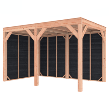 Deze modern vormgegeven overkapping biedt een perfecte balans tussen uitstraling en functionaliteit.De totale afmetingen zijn 245 cm hoog, 395 cm breed en 255 cm diep en de doorloophoogte is 224 cm.Zoek je een overdekte plek voor ontspanning in de tuin? Deze sfeervolle overkapping is een aanwinst voor iedere tuin.Natuurlijke uitstraling, degelijke kwaliteit.De wanden zijn bekleed met zwart Zweeds rabat en de constructie is gemaakt van onbehandeld Douglas met stevige staanders van 12x12cm.De keuze voor onbehandeld Douglas hout biedt een authentieke uitstraling en staat ook garant voor een lange levensduur.Klaar voor een groene toekomst:Dit modern vormgegeven tuinverblijf is speciaal ontworpen om zonnepanelen of een sedum dak te kunnen ondersteunen. Hierdoor is dit verblijf een duurzame en milieuvriendelijke aanvulling op uw tuin.Zelf aan de slagDankzij de duidelijke opbouwomschrijving, meegeleverde bevestigingsmaterialen en op maat gezaagde onderdelen, is de installatie van dit tuinhuis een haalbare klus voor iedere gemiddelde doe-het-zelver. Dak bekleding:Wij raden aan om deze Douglas overkapping te voorzien van een EPDM dakbekleding voor een lekvrij dak (Let op: los bij te bestellen).Onderhoud:Bij het kopen van een overkapping is onderhoud een aandachtspunt… Met Douglas hout heb je het goed voor elkaar, Douglas is namelijk van zichzelf al een sterke houtsoort. Het gaat zonder extra behandeling eenvoudig 10 tot 15 jaar mee. Om de maximale levensduur te verlengen kun je gebruik maken van speciale Douglas beits of Douglas olie en elke 2 jaar opnieuw beitsen of oliën.