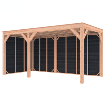 Deze modern vormgegeven overkapping biedt een perfecte balans tussen uitstraling en functionaliteit.De totale afmetingen zijn 245 cm hoog, 495 cm breed en 255 cm diep en de doorloophoogte is 224 cm.Zoek je een overdekte plek voor ontspanning in de tuin? Deze sfeervolle overkapping is een aanwinst voor iedere tuin.Natuurlijke uitstraling, degelijke kwaliteit.De wanden zijn bekleed met zwart Zweeds rabat en de constructie is gemaakt van onbehandeld Douglas met stevige staanders van 12x12cm.De keuze voor onbehandeld Douglas hout biedt een authentieke uitstraling en staat ook garant voor een lange levensduur.Klaar voor een groene toekomst:Dit modern vormgegeven tuinverblijf is speciaal ontworpen om zonnepanelen of een sedum dak te kunnen ondersteunen. Hierdoor is dit verblijf een duurzame en milieuvriendelijke aanvulling op uw tuin.Zelf aan de slagDankzij de duidelijke opbouwomschrijving, meegeleverde bevestigingsmaterialen en op maat gezaagde onderdelen, is de installatie van dit tuinhuis een haalbare klus voor iedere gemiddelde doe-het-zelver. Dak bekleding:Wij raden aan om deze Douglas overkapping te voorzien van een EPDM dakbekleding voor een lekvrij dak (Let op: los bij te bestellen).Onderhoud:Bij het kopen van een overkapping is onderhoud een aandachtspunt… Met Douglas hout heb je het goed voor elkaar, Douglas is namelijk van zichzelf al een sterke houtsoort. Het gaat zonder extra behandeling eenvoudig 10 tot 15 jaar mee. Om de maximale levensduur te verlengen kun je gebruik maken van speciale Douglas beits of Douglas olie en elke 2 jaar opnieuw beitsen of oliën.