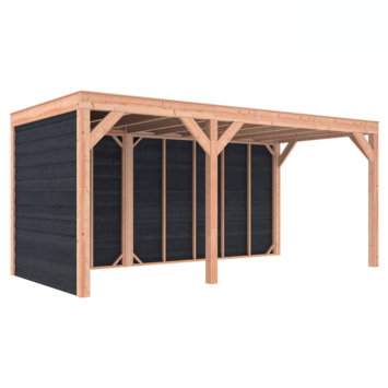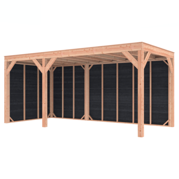 Deze modern vormgegeven overkapping biedt een perfecte balans tussen uitstraling en functionaliteit.De totale afmetingen zijn 245 cm hoog, 545 cm breed en 255 cm diep en de doorloophoogte is 224 cm.Zoek je een overdekte plek voor ontspanning in de tuin? Deze sfeervolle overkapping is een aanwinst voor iedere tuin.Natuurlijke uitstraling, degelijke kwaliteit.De wanden zijn bekleed met zwart Zweeds rabat en de constructie is gemaakt van onbehandeld Douglas met stevige staanders van 12x12cm.De keuze voor onbehandeld Douglas hout biedt een authentieke uitstraling en staat ook garant voor een lange levensduur.Klaar voor een groene toekomst:Dit modern vormgegeven tuinverblijf is speciaal ontworpen om zonnepanelen of een sedum dak te kunnen ondersteunen. Hierdoor is dit verblijf een duurzame en milieuvriendelijke aanvulling op uw tuin.Zelf aan de slagDankzij de duidelijke opbouwomschrijving, meegeleverde bevestigingsmaterialen en op maat gezaagde onderdelen, is de installatie van dit tuinhuis een haalbare klus voor iedere gemiddelde doe-het-zelver. Dak bekleding:Wij raden aan om deze Douglas overkapping te voorzien van een EPDM dakbekleding voor een lekvrij dak (Let op: los bij te bestellen).Onderhoud:Bij het kopen van een overkapping is onderhoud een aandachtspunt… Met Douglas hout heb je het goed voor elkaar, Douglas is namelijk van zichzelf al een sterke houtsoort. Het gaat zonder extra behandeling eenvoudig 10 tot 15 jaar mee. Om de maximale levensduur te verlengen kun je gebruik maken van speciale Douglas beits of Douglas olie en elke 2 jaar opnieuw beitsen of oliën.