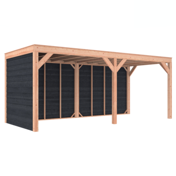 Deze modern vormgegeven overkapping biedt een perfecte balans tussen uitstraling en functionaliteit.De totale afmetingen zijn 245 cm hoog, 595 cm breed en 255 cm diep en de doorloophoogte is 224 cm.Zoek je een overdekte plek voor ontspanning in de tuin? Deze sfeervolle overkapping is een aanwinst voor iedere tuin.Natuurlijke uitstraling, degelijke kwaliteit.De wanden zijn bekleed met zwart Zweeds rabat en de constructie is gemaakt van onbehandeld Douglas met stevige staanders van 12x12cm.De keuze voor onbehandeld Douglas hout biedt een authentieke uitstraling en staat ook garant voor een lange levensduur.Klaar voor een groene toekomst:Dit modern vormgegeven tuinverblijf is speciaal ontworpen om zonnepanelen of een sedum dak te kunnen ondersteunen. Hierdoor is dit verblijf een duurzame en milieuvriendelijke aanvulling op uw tuin.Zelf aan de slagDankzij de duidelijke opbouwomschrijving, meegeleverde bevestigingsmaterialen en op maat gezaagde onderdelen, is de installatie van dit tuinhuis een haalbare klus voor iedere gemiddelde doe-het-zelver. Dak bekleding:Wij raden aan om deze Douglas overkapping te voorzien van een EPDM dakbekleding voor een lekvrij dak (Let op: los bij te bestellen).Onderhoud:Bij het kopen van een overkapping is onderhoud een aandachtspunt… Met Douglas hout heb je het goed voor elkaar, Douglas is namelijk van zichzelf al een sterke houtsoort. Het gaat zonder extra behandeling eenvoudig 10 tot 15 jaar mee. Om de maximale levensduur te verlengen kun je gebruik maken van speciale Douglas beits of Douglas olie en elke 2 jaar opnieuw beitsen of oliën.