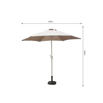 De stokparasol Florida zorgt voor fijne zonbescherming in je tuin of op het terras. Met een diameter van 270 cm en een hoogte van 235 cm is deze parasol gemaakt van metaal en heeft een polyester doek dat spatwaterbestendig is. De parasol biedt UV-bescherming van factor 30, perfect voor zonnige dagen. Dankzij de hendel is hij makkelijk uit te klappen en het doek is eenvoudig schoon te maken. Voor een langere levensduur kun je de parasol het beste afdekken met een hoes en opbergen op een droge, beschutte plek. Vergeet niet een parasolvoet van minimaal 30 kg voor de nodige stabiliteit.