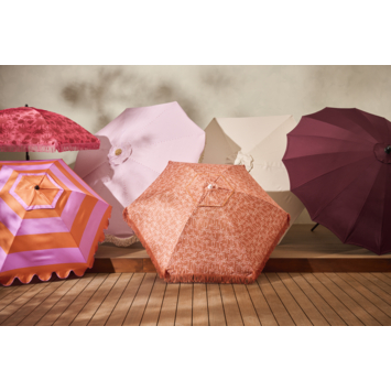 De Parasol Marbella terracotta streep ø 250 cm zorgt voor een aangename schaduwplek in je tuin of op je terras. Met een diameter van 250 cm zit je gemakkelijk met meerdere personen uit de zon. Dankzij de hoogte van 230 cm voelt het ruim en comfortabel aan.