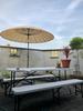 Prachtige parasol die super handig en makkelijk is. Precies groot genoeg en een mooi designe. Met een verrijdbare voet van 30 kilo in de kantel stand heeft ie het wel zwaar met een stevige windvlaag maar tot nu toe blijft ie wel staan.