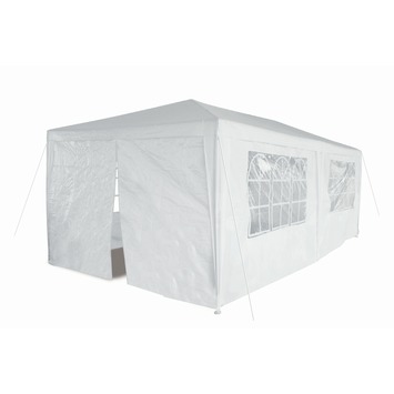 Deze partytent heeft zijn naam niet gestolen: fiesta! Weer of geen weer: elke fiesta wordt een feest met deze stijlvolle, witte tent die je gasten te allen tijde droog houdt. Dankzij de plastieken ramen hoef je zelfs niet in het donker te zitten, zodat je toch nog van het buitengevoel kan genieten. De partytent is makkelijk op te zetten en even makkelijk weer af te breken.