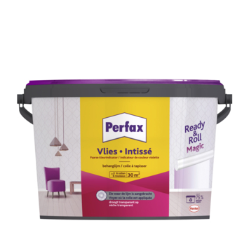 De Perfax Ready & Roll Magic behanglijm vliesbehang 4,5 kg is kant-en-klaar en speciaal gemaakt voor vliesbehang en behang met vliesrug. Je brengt het behangplaksel direct op de muur aan waardoor je zonder plaktafel kan werken en tijd bespaart. Tijdens het aanbrengen kleurt de lijm paars zodat je goed ziet waar je al hebt gelijmd. Na droging wordt hij transparant en zie je niets meer terug. Het behang kan je later droog afstrippen waardoor het eenvoudig te verwijderen is. Daarnaast is de lijm geurloos en vochtbestendig en hecht hij stevig op gipskartonplaten, gipsplaten, beton en hout. Voor een juiste verwerking gebruik je hem binnenshuis bij temperaturen tussen 5 en 25 graden.