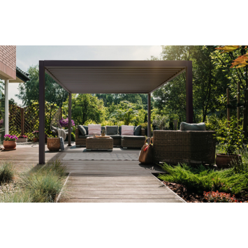 Het lamellendak van de pergola kun je eenvoudig zelf bedienen (open en dicht), waardoor je in elke situatie comfortabel buiten kunt zitten.