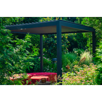 Het lamellendak van de pergola kun je eenvoudig zelf bedienen (open en dicht), waardoor je in elke situatie comfortabel buiten kunt zitten.