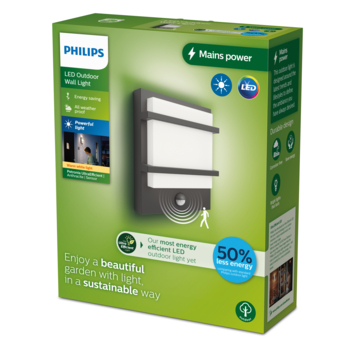 De Philips Petronia LED-buitenwandlamp heeft een lichtpaneel in een antracietgrijs aluminium frame met bewegingssensor. Deze lamp behoort tot de categorie Ultra Efficient-buitenlampen die gebruik maakt van innovatieve technologie om aanzienlijk meer energie te besparen en materiaalverspilling te verminderen. Met een indrukwekkende levensduur van 50.000 uur overtreffen deze lampen de standaard LED-buitenlampen van Philips met meer dan twee keer en verminderen het energieverbruik met 50%.