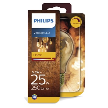 De Philips LED-lamp is een alternatief voor de halogeenlamp, spaarlamp en gloeilamp. Met LED-verlichting bespaar je op je verlichtingskosten en gaat het product langer mee. Deze lamp heeft de vorm van een bulb en bevat goudkleurig glas. De verlichtingsbron heeft een lichtopbrengst van 250 lm en een kleurtemperatuur van 2000 K. Met een flame lichtkleur creëer je een prettige sfeer in de slaap- of woonkamer. De lamp bevat een E27 fitting en een vermogen van 5,5 W. Ook is deze lamp dimbaar door middel van een wanddimmer. Kortom: de Philips LED-lamp is een ideale verlichtingsbron om een ontspannen sfeer te creëren in de woonkamer.