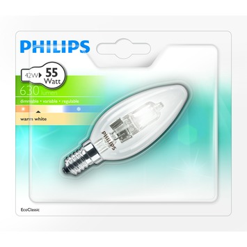 De Philips EcoClassic halogeenlamp E14 42W helder is een ecohalogeenlamp van 630 lumen of 42 watt geschikt voor een E14-fitting. Het warmwitte licht van deze kaarsvormige lamp heeft een natuurlijke uitstraling die de kleuren van je interieur doen opleven. Je kan deze lamp zelfs dimmen, zodat je de hoeveelheid licht eenvoudig aan de gewenste sfeer kan aanpassen. Bovendien gaat deze lamp met een levensduur van 2000 uur twee keer langer mee dan een standaard lamp. Kortom, de Philips EcoClassic halogeenlamp E14 42W helder biedt sprankelend licht in een vertrouwde vorm.