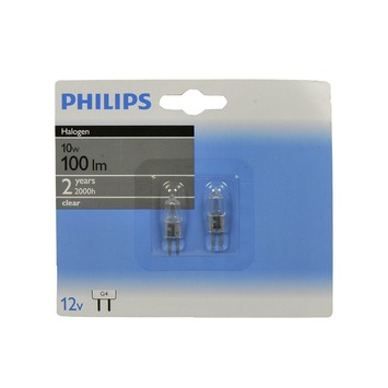 De Philips steeklamp G4 10W helder is een halogeencapsulelamp geschikt voor een G4 fitting. De lamp heeft een vermogen van 10 watt, hiermee heeft de lamp een lichtopbrengst van 100 lumen. De lamp geeft helder natuurlijk licht in een warmwitte kleur. Daarbij kan je de lamp dimmen en is het dus mogelijk om de intensiteit van het licht te variëren, van sprankelend licht tot een warme gloed. Bovendien heeft de lamp een levensduur van 2000 uur, dit is twee keer langer dan andere lampen. De lamp schijnt direct met maximale helderheid.