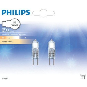 De Philips steeklamp G4 50W 12V helder 2 stuks zijn halogeencapsulelampen geschikt voor een GY6.35 fitting. De lampen hebben een vermogen van 50 watt, hiermee hebben de lampen een lichtopbrengst van 255 lumen. De lampen geven helder natuurlijk licht in een warmwitte kleur. Daarbij kan je de lampen dimmen en is het dus mogelijk om de intensiteit van het licht te variëren, van sprankelend licht tot een warme gloed. Bovendien hebben de lampen een levensduur van 2000 uur, dit is twee keer langer dan andere lampen. De lampen schijnen direct met maximale helderheid.