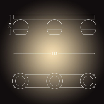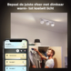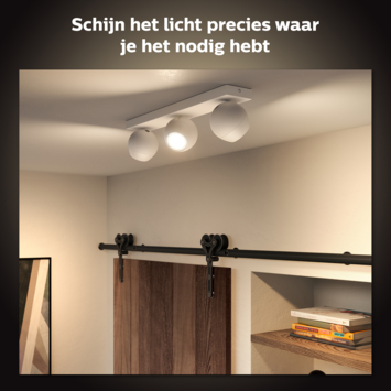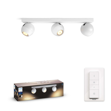 De witte Philips Hue Buckram 3-lichts opbouwspot bestaat uit een rechthoekige basisplaat met drie verstelbare, bolvormige spots naast elkaar. Deze zijn allemaal voorzien van een White ambiance LED-lamp die keuze biedt uit warm tot koelwit licht. Daarmee ben je dus voorbereid op elke situatie, van lekker ontspannen tot geconcentreerd lezen. Je kunt de spots gemakkelijk in- en uitschakelen en dimmen via de meegeleverde Philips Hue dimmer switch of via de handige Hue app. Nog meer mogelijkheden heb je met de Philips Hue Bridge, die los verkrijgbaar is. De Bridge geeft je toegang tot alle Hue functies zoals timers en routines.