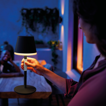 Deze draagbare slimme lamp in strak zwart design en donkergrijs handvat laat jou overal genieten van de juiste sfeer. Creëer slimme verlichting waar jij dit nodig hebt. De Hue Go is zowel geschikt voor binnen als buiten, ideaal dus voor een gezellig verlicht etentje in de tuin of op het terras. Of lees je liever een boek in een knus hoekje in de huiskamer? Met de Hue Go heb je de juiste verlichting waar jij dat nodig hebt. Met een batterijduur van maar liefst 48 uur geniet je altijd van het juiste licht. In 3 tot 4 uur is de Hue Go weer volledig opgeladen met behulp van het meegeleverde laadstation. Zet hem aan of uit met één druk op de knop bovenop de Hue Go en scrol door vooraf ingestelde lichtscènes. Druk twee keer en houd de knop de tweede keer ingedrukt om door vooraf ingestelde lichtscènes te bladeren. Bedien de Hue Go eenvoudig met de Hue app en kies uit 50.000 wittinten en 60 miljoen kleuren. Ga voor eindeloze mogelijkheden en creëer de perfecte sfeer met de Hue Go!