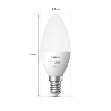 Deze volledig dimbare Philips Hue slimme E14 LED-kaarslamp geeft een aangename, zachte warmwitte gloed. De lamp past in elk armatuur met een kleine E14-fitting, en de vorm van de kaarslamp komt uitstekend tot zijn recht in een kroonluchter. Je bedient de Philips Hue white kaarslamp direct via Bluetooth met de Philips Hue Bluetooth app op je smartphone of tablet. Je kunt echter ook verbinding maken met een Hue bridge voor toegang tot alle slimme verlichtingsfuncties, zoals het personaliseren van lichtscènes, het instellen van timers en nog veel meer