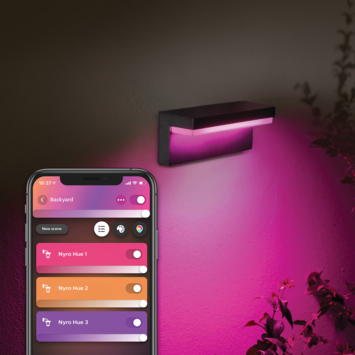 De Philips Hue Nyro white and color ambiance muurlamp geeft een geweldige gevelverlichting. Je kunt kiezen uit 16 miljoen kleuren en 50.000 wittinten. Het licht verspreidt zich met een mooi en subtiel effect over een groot gedeelte van de muur. Door de lamp te koppelen aan je Philips Hue Bridge kun je elke kleur op je gevel toveren en op elk gewenst tijdstip veranderen. Je bedient de slimme lampen dan met de Hue app via smartphone of tablet, ook als je niet thuis bent. Met geofencing kun je bovendien je lampen automatisch laten aangaan als je het huis nadert. De Hue Nyro is bestand tegen alle weersomstandigheden (IP44-norm).