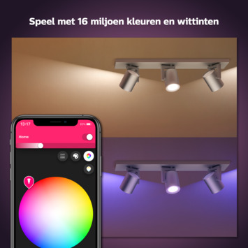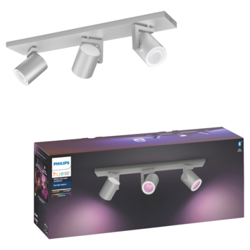 Makkelijke slimme verlichting. Creëer de perfecte ambiance met Philips Hue Argenta in aluminiumuitvoering. De Argenta heeft een rechthoekige voet en de 3 spots zijn voorzien van white and color ambiance LED-lampen met licht in 50.000 wittinten en 16 miljoen kleuren. Ideaal dus voor sfeer- en accentverlichting in je woonkamer en slaapkamer. Je kunt je nieuwe verlichting rechtstreeks bedienen via Bluetooth met de Philips Hue Bluetooth app op je smartphone of tablet. Wil je meer slimme verlichtingsopties? Verbind dan de lampen met de Philips Hue bridge, die je toegang geeft tot alle mogelijkheden, zoals het personaliseren van lichtscènes, het instellen van timers en nog veel meer.Makkelijke slimme verlichtingBedien tot wel 10 lampen met de Bluetooth-appMet de Hue Bluetooth-app kun je de slimme Hue lampen in elke kamer van je huis bedienen. Voeg tot wel 10 slimme lampen toe en bedien ze allemaal heel eenvoudig met je smartphone of tablet. Creëer een persoonlijke beleving met gekleurd slim lichtTransformeer je huis met meer dan 16 miljoen kleuren en creëer onmiddellijk de juiste sfeer voor elke gebeurtenis. In een handomdraai verhoog je zo de feeststemming op een feest, verander je je woonkamer in een filmzaal, breng je de inrichting van je huis tot leven met kleuraccenten en nog veel meer. Creëer de juiste sfeer met warm tot koelwit lichtDeze lampen bieden verschillende tinten warm tot koelwit licht. Omdat de lampen volledig kunnen worden gedimd van zeer helder tot subtiele nachtlampjes, kun je de lampen instellen op de perfecte tint en helderheid voor elk moment. Creëer de perfecte lichtrecepten voor je dagelijkse activiteitenErvaar het gemak en de aangename sfeer van vier standaardlichtrecepten, speciaal voor je dagelijkse activiteiten: Energie en Concentratie, Lezen en Ontspannen. De twee scènes met koele kleuren, Energie en Concentratie, helpen je 's ochtends op weg en houden je scherp. De warmere scènes Lezen en Ontspannen zijn perfect voor het lezen van een boek en om te ontspannen na een drukke dag. Bedien je lampen met je stemBedien je lampen handsfree en gebruik je stem in plaats van een mobiel apparaat! Met eenvoudige spraakopdrachten kun je meerdere lampen of slechts één lamp in een kamer bedienen. Werkt samen met Alexa, Google Assistent of Siri. Ontgrendel alle mogelijkheden van slim licht met de Hue bridgeVoeg een Hue bridge (afzonderlijk verkrijgbaar) toe aan je slimme LED-lampen en ervaar alle mogelijkheden van Philips Hue. Met een Hue bridge kun je tot maar liefst 50 lampen toevoegen om in en rond je hele huis de perfecte sfeer te creëren. Maak timers en routines, gebruik je lichten om beter wakker te worden en bij het slapengaan. Bedien je lampen ook als je niet thuis bent of voeg slimme accessoires toe, zoals bewegingssensoren en slimme draadloze schakelaars.