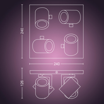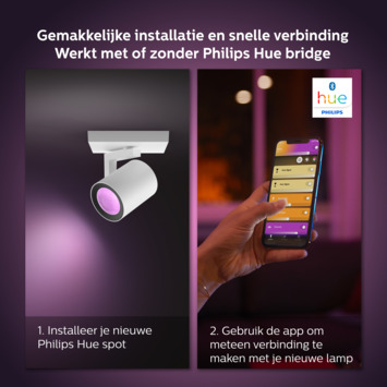 Makkelijke slimme verlichting. Creëer de gewenste sfeer in je woonkamer en slaapkamer met deze witte Philips Hue Argenta opbouwspot. De opbouwspot heeft een vier richtbare spots op een vierkante voet. De white and color ambiance LED-lampen geven licht in 50.000 wittinten en meer dan 16 miljoen kleuren. Via Bluetooth kun je de lampen rechtstreeks bedienen met de Philips Hue Bluetooth app op je smartphone of tablet. Maar je kunt ook verbinding maken met een Hue bridge voor toegang tot allerlei extra functies zoals het personaliseren van lichtscènes, het instellen van timers en nog veel meer.Makkelijke slimme verlichtingBedien tot wel 10 lampen met de Bluetooth-appMet de Hue Bluetooth-app kun je de slimme Hue lampen in elke kamer van je huis bedienen. Voeg tot wel 10 slimme lampen toe en bedien ze allemaal heel eenvoudig met je smartphone of tablet. Creëer een persoonlijke beleving met gekleurd slim lichtTransformeer je huis met meer dan 16 miljoen kleuren en creëer onmiddellijk de juiste sfeer voor elke gebeurtenis. In een handomdraai verhoog je zo de feeststemming op een feest, verander je je woonkamer in een filmzaal, breng je de inrichting van je huis tot leven met kleuraccenten en nog veel meer. Creëer de juiste sfeer met warm tot koelwit lichtDeze lampen bieden verschillende tinten warm tot koelwit licht. Omdat de lampen volledig kunnen worden gedimd van zeer helder tot subtiele nachtlampjes, kun je de lampen instellen op de perfecte tint en helderheid voor elk moment. Creëer de perfecte lichtrecepten voor je dagelijkse activiteitenErvaar het gemak en de aangename sfeer van vier standaardlichtrecepten, speciaal voor je dagelijkse activiteiten: Energie en Concentratie, Lezen en Ontspannen. De twee scènes met koele kleuren, Energie en Concentratie, helpen je 's ochtends op weg en houden je scherp. De warmere scènes Lezen en Ontspannen zijn perfect voor het lezen van een boek en om te ontspannen na een drukke dag. Bedien je lampen met je stemBedien je lampen handsfree en gebruik je stem in plaats van een mobiel apparaat! Met eenvoudige spraakopdrachten kun je meerdere lampen of slechts één lamp in een kamer bedienen. Werkt samen met Alexa, Google Assistent of Siri. Ontgrendel alle mogelijkheden van slim licht met de Hue bridgeVoeg een Hue bridge (afzonderlijk verkrijgbaar) toe aan je slimme LED-lampen en ervaar alle mogelijkheden van Philips Hue. Met een Hue bridge kun je tot maar liefst 50 lampen toevoegen om in en rond je hele huis de perfecte sfeer te creëren. Maak timers en routines, gebruik je lichten om beter wakker te worden en bij het slapengaan. Bedien je lampen ook als je niet thuis bent of voeg slimme accessoires toe, zoals bewegingssensoren en slimme draadloze schakelaars.