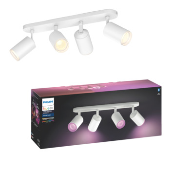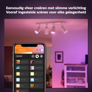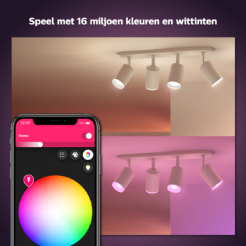 Makkelijke slimme verlichting. Creëer altijd de juiste sfeer met de Philips Hue Fugato slimme opbouwspot. De vier white and color ambiance LED-lampen leveren 50.000 wittinten en 16 miljoen kleuren. Perfect voor je woonkamer of slaapkamer. De spots, op een rechthoekige voet, hebben aan het uiteinde een ring die in kleur oplicht. Gebruik de Philips Hue Bluetooth app om de lampen rechtstreeks via Bluetooth in- of uit te schakelen, te dimmen of de kleur aan te passen. Verbind met de Hue bridge voor toegang tot alle slimme verlichtingsfuncties, zoals het personaliseren van lichtscènes, het instellen van timers en nog veel meer.Makkelijke slimme verlichtingBedien tot wel 10 lampen met de Bluetooth-appMet de Hue Bluetooth-app kun je de slimme Hue lampen in elke kamer van je huis bedienen. Voeg tot wel 10 slimme lampen toe en bedien ze allemaal heel eenvoudig met je smartphone of tablet. Creëer een persoonlijke beleving met gekleurd slim lichtTransformeer je huis met meer dan 16 miljoen kleuren en creëer onmiddellijk de juiste sfeer voor elke gebeurtenis. In een handomdraai verhoog je zo de feeststemming op een feest, verander je je woonkamer in een filmzaal, breng je de inrichting van je huis tot leven met kleuraccenten en nog veel meer. Creëer de juiste sfeer met warm tot koelwit lichtDeze lampen bieden verschillende tinten warm tot koelwit licht. Omdat de lampen volledig kunnen worden gedimd van zeer helder tot subtiele nachtlampjes, kun je de lampen instellen op de perfecte tint en helderheid voor elk moment. Creëer de perfecte lichtrecepten voor je dagelijkse activiteitenErvaar het gemak en de aangename sfeer van vier standaardlichtrecepten, speciaal voor je dagelijkse activiteiten: Energie en Concentratie, Lezen en Ontspannen. De twee scènes met koele kleuren, Energie en Concentratie, helpen je 's ochtends op weg en houden je scherp. De warmere scènes Lezen en Ontspannen zijn perfect voor het lezen van een boek en om te ontspannen na een drukke dag. Bedien je lampen met je stemBedien je lampen handsfree en gebruik je stem in plaats van een mobiel apparaat! Met eenvoudige spraakopdrachten kun je meerdere lampen of slechts één lamp in een kamer bedienen. Werkt samen met Alexa, Google Assistent of Siri. Ontgrendel alle mogelijkheden van slim licht met de Hue bridgeVoeg een Hue bridge (afzonderlijk verkrijgbaar) toe aan je slimme LED-lampen en ervaar alle mogelijkheden van Philips Hue. Met een Hue bridge kun je tot maar liefst 50 lampen toevoegen om in en rond je hele huis de perfecte sfeer te creëren. Maak timers en routines, gebruik je lichten om beter wakker te worden en bij het slapengaan. Bedien je lampen ook als je niet thuis bent of voeg slimme accessoires toe, zoals bewegingssensoren en slimme draadloze schakelaars.