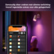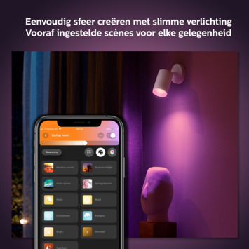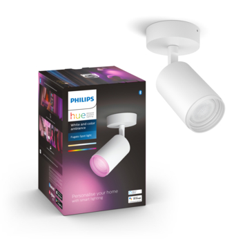 Makkelijke slimme verlichting. Met de witte Philips Hue Fugato opbouwspot verlicht je de favoriete objecten in je kamer met een prachtige lichtbundel. De white and color ambiance LED-lamp geeft licht in wel 50.000 wittinten en meer dan 16 miljoen kleuren zodat je altijd de juiste sfeer kan creëren. De spot heeft een ronde voet en de kop heeft ook een rand die oplicht in je favoriete kleur. Dankzij de Philips Hue Bluetooth app kun je het licht van deze moderne opbouwspot eenvoudig vanaf je smartphone of tablet uitschakelen, van kleur veranderen of zelfs dimmen. Wil je toegang tot alle slimme verlichtingsfuncties, zoals het personaliseren van lichtscènes, het instellen van timers en nog veel meer, maak dan verbinding met een Hue bridge. Makkelijke slimme verlichtingBedien tot wel 10 lampen met de Bluetooth-appMet de Hue Bluetooth-app kun je de slimme Hue lampen in elke kamer van je huis bedienen. Voeg tot wel 10 slimme lampen toe en bedien ze allemaal heel eenvoudig met je smartphone of tablet. Creëer een persoonlijke beleving met gekleurd slim lichtTransformeer je huis met meer dan 16 miljoen kleuren en creëer onmiddellijk de juiste sfeer voor elke gebeurtenis. In een handomdraai verhoog je zo de feeststemming op een feest, verander je je woonkamer in een filmzaal, breng je de inrichting van je huis tot leven met kleuraccenten en nog veel meer. Creëer de juiste sfeer met warm tot koelwit lichtDeze lampen bieden verschillende tinten warm tot koelwit licht. Omdat de lampen volledig kunnen worden gedimd van zeer helder tot subtiele nachtlampjes, kun je de lampen instellen op de perfecte tint en helderheid voor elk moment. Creëer de perfecte lichtrecepten voor je dagelijkse activiteitenErvaar het gemak en de aangename sfeer van vier standaardlichtrecepten, speciaal voor je dagelijkse activiteiten: Energie en Concentratie, Lezen en Ontspannen. De twee scènes met koele kleuren, Energie en Concentratie, helpen je 's ochtends op weg en houden je scherp. De warmere scènes Lezen en Ontspannen zijn perfect voor het lezen van een boek en om te ontspannen na een drukke dag. Bedien je lampen met je stemBedien je lampen handsfree en gebruik je stem in plaats van een mobiel apparaat! Met eenvoudige spraakopdrachten kun je meerdere lampen of slechts één lamp in een kamer bedienen. Werkt samen met Alexa, Google Assistent of Siri. Ontgrendel alle mogelijkheden van slim licht met de Hue bridgeVoeg een Hue bridge (afzonderlijk verkrijgbaar) toe aan je slimme LED-lampen en ervaar alle mogelijkheden van Philips Hue. Met een Hue bridge kun je tot maar liefst 50 lampen toevoegen om in en rond je hele huis de perfecte sfeer te creëren. Maak timers en routines, gebruik je lichten om beter wakker te worden en bij het slapengaan. Bedien je lampen ook als je niet thuis bent of voeg slimme accessoires toe, zoals bewegingssensoren en slimme draadloze schakelaars.