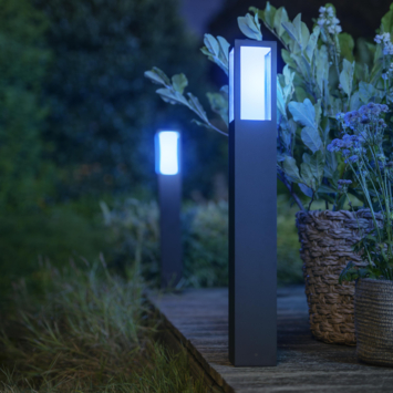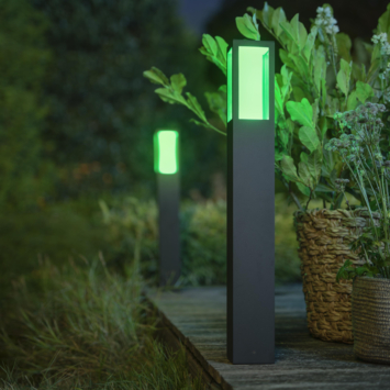 De strakke vormgeving van de hoge zwarte Philips Hue Impress White and color ambiance sokkellamp past in allerlei buitenomgevingen. De ingebouwde LED-verlichting achter de glazen panelen levert licht in 16 miljoen kleuren en laat zich eenvoudig bedienen als je de lamp verbindt met een Philips Hue Bridge. Via de Philips Hue app op je smartphone of tablet beschik je dan over tal van slimme lichtfuncties zoals bediening op afstand (als je niet thuis bent), timers en geofencing-technologie. Dat betekent dat de buitenverlichting automatisch aangaat als je je huis nadert. De lamp is bovendien weerbestendig met een IP44-classificatie, dus je hoeft je geen zorgen te maken over regen en wind.