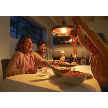 Personaliseer je verlichting met Hue White Ambiance van Philips. Combineer deze dimbare wit-gele lamp van 5,5 watt of 250 lumen (2 stuks) met een starterskit, een dimmingkit of een bridge van hetzelfde systeem, zodat je meteen aan de slag kan. De bridge is het hart van het Hue-systeem, nl. de link tussen je lampen en je smartphone. Goed om te weten: Hue is slimme, energiezuinige verlichting van Philips voor in heel je huis. Deze ledverlichting maakt het mogelijk om je verlichting wireless te bedienen via een gratis app op je smartphone of tablet. Op die manier kan je, ook vanop afstand, de verlichting in alle kamers van je huis afstemmen op jouw persoonlijke voorkeur en behoefte.