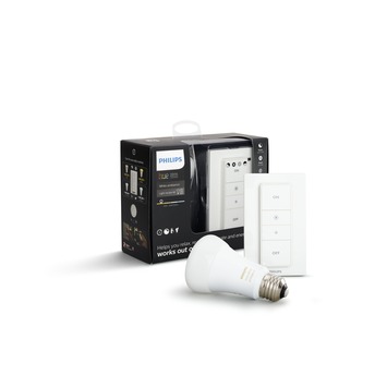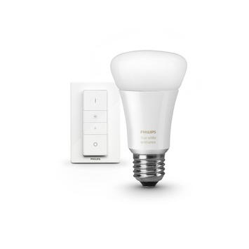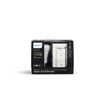 De Philips Hue White Ambiance Dimming kit LED E27 9.5 watt bestaat uit een LED-lamp van 9.5 watt en een handige dimmer switch. Hiermee kun je de lamp eenvoudig dimmen zonder snoeren, elektricien of installatie. De draadloze dimmer switch kun je ophangen, maar je kunt hem ook bij de hand houden zodat hij als afstandsbediening gebruikt kan worden voor jouw Philips Hue verlichtingssysteem. Zo schakel je de verlichting eenvoudig aan of uit en dim je naar de gewenste helderheid. De lamp is geschikt voor armaturen met een E27 fitting en past daarom in veel soorten armatuur. Kortom, de Philips Hue White Ambiance Dimming kit is een eenvoudig bedieningssysteem voor de Hue lampen.