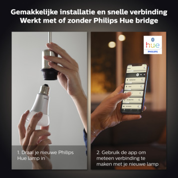 Deze volledig dimbare slimme LED-lamp met E27-fitting geeft een aangename, zachte warmwitte gloed. Bedien de Philips Hue white lamp direct via Bluetooth of maak verbinding met een Hue Bridge voor toegang tot alle slimme verlichtingsfuncties, zoals het personaliseren van lichtscènes, het instellen van timers en nog veel meer.