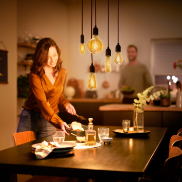 Met deze Philips LED filamentlamp zorg je voor extra sfeer in huis. Ze zorgen voor een stijlvol lichtelement en geven sfeervol warmwit licht. Deze lamp heeft een gouden coating en in de lamp zie je een dimbare lichtspiraal, wat doet denken aan gloeilampen van vroeger. Met EyeComfort, voor licht dat aangenaam is voor uw ogen. De lamp heeft een E14-fitting, en past dus in de meeste lampen met kleine fitting.