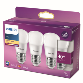 Vervang uw oude kleine kogellamp met een nieuwe energiezuinige Philips LED-lamp, met warmwit licht. Deze lampen verbruiken circa 80% minder energie dan traditionele lampen dankzij de nieuwste energiezuinige LED-technologie en ze gaan tien keer langer mee. Met EyeComfort, voor licht dat aangenaam is voor uw ogen. Deze lampen hebben een E27-fitting, en passen dus in de meeste lampen met grote fitting.