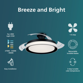 De zwarte Philips Bliss LED-plafondlamp combineert verlichting met een uitschuifbare ventilator voor een verfrissend briesje. Met de SceneSwitch-functie stel je via je bestaande lichtschakelaar eenvoudig de lichtsterkte in op 100%, 40% of 10% en creëer je altijd de juiste sfeer.