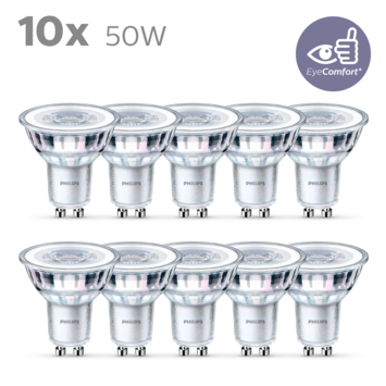 Vervang 10 oude spotlampen door deze nieuwe energiezuinige Philips LED-spots, met koelwit licht, en bespaar tot €30 op energiekosten per lamp per jaar. Deze standaardlampen verbruiken tot 90% minder energie dan gloei- en halogeenlampen dankzij de nieuwste energiezuinige LED-technologie. Daarnaast gaan ze gaan tien keer langer mee. Met EyeComfort, voor licht dat aangenaam is voor jouw ogen. Deze lampen hebben een GU10-fitting en gaan vaak perfect samen met jouw in- of opbouwspots.