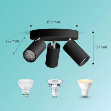 Lampen worden niet meegeleverd, zodat je zelf je verlichting kunt kiezen. Kies bijvoorbeeld voor een Ultra Efficient GU10 spot, een SceneSwitch-spot of slimme Philips Hue verlichting. De spots zijn geschikt voor LED-verlichting tot maximaal 5 W per spot.