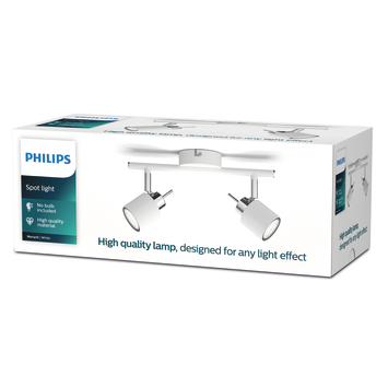 Creëer de juiste sfeer met de functionele witte Philips Essentials Meranti opbouwspot. Kantel en richt de twee spotlampen precies zoals jij het wilt. Voor het mooiste lichteffect, combineer je deze opbouwspot met een dimbare energiezuinige Philips LED-lamp met GU10-fitting.