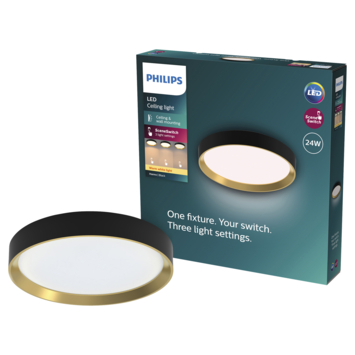 Minimalistisch en toch elegant; dat is de Philips Hanno plafondlamp. De Hanno heeft een geïntegreerde LED-lichtbron met warmwit licht (kleurtemperatuur: 2700K) in een modern zwart en goudkleurig design dat in elke woonkamer tot zijn recht komt. Door de SceneSwitch-technologie kun je de helderheid eenvoudig regelen met je eigen wandschakelaar. Stel de lamp in op 100%, 50% of 10% helderheid door simpelweg de schakelaar in te drukken. Deze lamp kun je eenvoudig zelf installeren in 4 eenvoudige stappen. Deze combinatie van stijl en gebruiksgemak maakt de Philips Hanno de ideale verlichting voor jouw thuis.