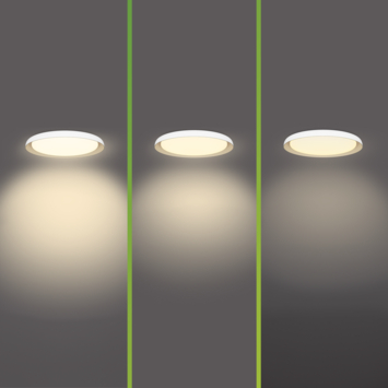 De geïntegreerde LED-lichtbron geeft warmwit licht (2700 K) en is verwerkt in een modern wit design met goudkleurig accent, geschikt voor de woonkamer. Met SceneSwitch stel je de helderheid eenvoudig in via je bestaande wandschakelaar. Kies tussen 100%, 50% of 10% lichtsterkte door de schakelaar kort te bedienen.