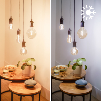 Het warme tot koelwitte licht van deze twee druppelvormige Philips Smart LED filamentlampen met een gouden gloed geven elke ruimte een vintage uitstraling. De lampen met E27-fitting zijn eenvoudig te bedienen via de WiZ app. Dim de lampen, zet ze feller of kies één van de voorgeprogrammeerde lichtscènes. Stel bijvoorbeeld een 24-uurs ritme in en word wakker met koel licht om met wat extra energie aan de dag te beginnen. 's Avonds laat wordt het licht automatisch wat warmer, zodat je lekker ontspannen onder de wol kunt kruipen. Ontdek nog veel meer ritmes en scènes, waar je elke dag wat aan hebt. Gemakkelijk te bedienen via je eigen wifinetwerk met de WiZ app of je stem.