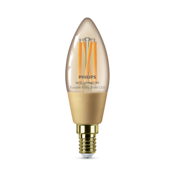 Door de gouden gloed van deze slimme Philips Smart LED filamentkaarslamp met E14-fitting voeg je een vleugje vintage toe aan je interieur. Kies uit verschillende tinten warm- of koelwit licht. De lamp is eenvoudig te bedienen via de WiZ app. Dim de lamp, zet hem feller of kies één van de voorgeprogrammeerde lichtscènes. Stel bijvoorbeeld een 24-uurs ritme in en word wakker met koel licht om met wat extra energie aan de dag te beginnen. 's Avonds laat wordt het licht automatisch wat warmer, zodat je lekker ontspannen onder de wol kunt kruipen. Ontdek nog veel meer ritmes en scènes, waar je elke dag wat aan hebt. Gemakkelijk te bedienen via je eigen wifinetwerk met de WiZ app of je stem.