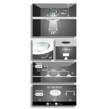De Philips SmartSpot Talitha inbouwspotset bestaat uit 3 ronde LEDspots met een maximaal verbruik van slechts 2,5 Watt. Dankzij de energiebesparende techniek en de lange levensduur heb je deze spot in geen tijd terugverdiend. De 3 LED's bieden een warm wit licht. Bovendien zijn de spots dimbaar en draaibaar zodat je zelf de lichtintensiteit en -richting kunt bepalen. Met de slimme combinatie van licht en design is de SmartSpot van Philips een hebbeding voor in elk interieur.
