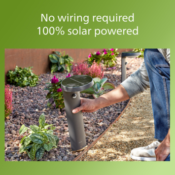De Philips Tyla sokkellamp werkt volledig op zonne-energie. Geen zorgen meer over elektrische kosten of CO2-uitstoot. Het zonnepaneel vangt genoeg energie op om de lamp 's nachts te laten branden, zonder dat je iets hoeft te doen. Deze lamp is gemaakt van hoogwaardig gegoten aluminium en synthetische materialen. Dit zorgt niet alleen voor een elegante uitstraling, maar ook voor een lange levensduur. Je hoeft je geen zorgen te maken over weersinvloeden, dankzij de IP44-bescherming die spatwaterdicht is. Of je nu je tuin, terras, oprit of paden wilt verlichten, deze sokkellamp is de perfecte keuze. Met de geïntegreerde bewegingssensor gaat het licht alleen aan als dat nodig is. Dit zorgt voor extra veiligheid en een warm welkom wanneer je thuiskomt. De lamp geeft een warm wit licht dat een gezellige sfeer creëert.
