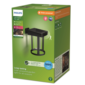De Philips wandlamp rond Camill werkt volledig op zonne-energie. Er is geen bedrading nodig, waardoor je deze verlichting eenvoudig kunt installeren en verplaatsen naar een andere plek in je tuin of buitenruimte. De Philips Ultra Efficient Solar-technologie zorgt voor heldere verlichting, zelfs bij bewolkt weer. Dankzij de ingebouwde bewegingssensor gaat de lamp automatisch aan wanneer je in het donker thuiskomt of wanneer er bezoekers arriveren. Dit verhoogt je gevoel van veiligheid en zorgt voor optimale energie-efficiëntie. De lamp brandt normaal op een laag niveau maar schijnt fel bij detectie van beweging. Bevestig de lamp waar je maar wilt en hij is klaar voor gebruik. Dit maakt de lamp een flexibele en veelzijdige verlichtingsoplossing voor verschillende buitenruimtes. Bovendien is de lamp waterbestendig met een IP44-classificatie, dus je kunt erop vertrouwen dat hij bestand is tegen de weersomstandigheden.