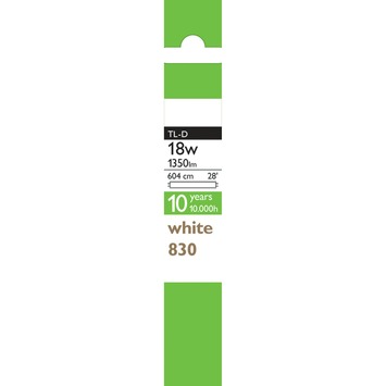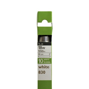 De Philips tl-buis 18 W warm wit is een fluorescentielamp van 18 watt of 1350 lumen met een warme witte lichtkleur, die overeenkomt met 3000 Kelvin. De lamp is 60 centimeter lang en heeft een diameter van 26 millimeter (net zoals elke T8). Tip: deze energiezuinige lamp is verkrijgbaar in verschillende afmetingen met diverse wattages.