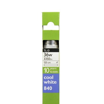 De Philips tl-buis 36 W koud wit is een fluorescentielamp van 36 watt of 3350 lumen met een koude witte lichtkleur, die overeenkomt met 4100 Kelvin. De lamp is 121 centimeter lang en heeft een diameter van 26 millimeter (net zoals elke T8). Tip: deze energiezuinige lamp is verkrijgbaar in verschillende afmetingen met diverse wattages.