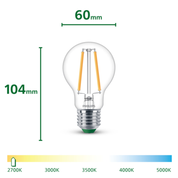 Deze peervormige Philips UltraEfficient LED filamentlamp met energielabel A behoort tot onze meest energiezuinige lampen ooit. Door 50% minder energieverbruik én een 3,5x langere levensduur dan de gemiddelde LED-lamp bespaar je nóg meer kosten op je energierekening. Omdat deze lamp tot 50 jaar meegaat verspil je ook minder materiaal waardoor je eenvoudig bijdraagt aan een beter klimaat; met LED kan het! Deze lamp met E27-fitting geeft gezellig warmwit licht voor een fijne sfeer.